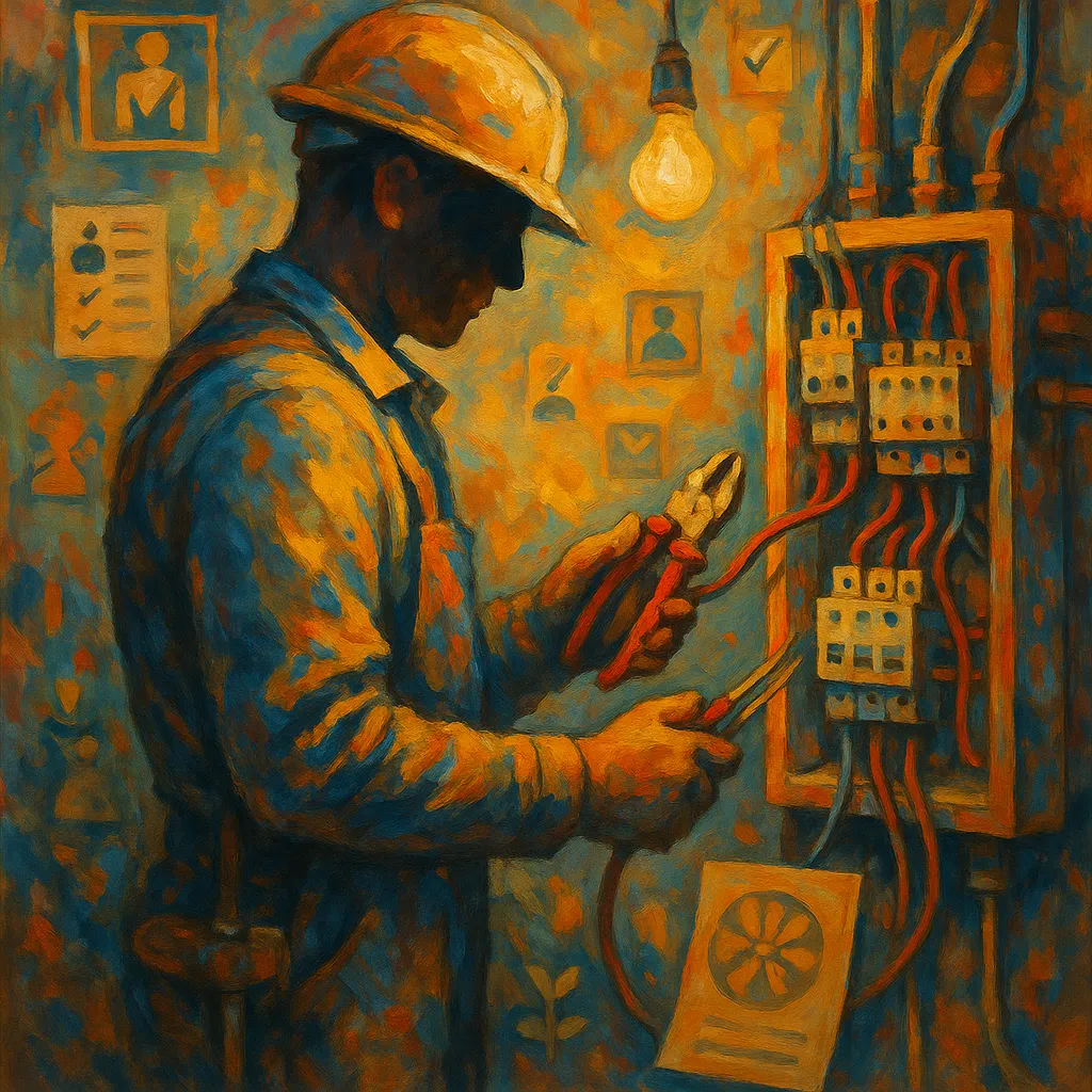 - 電気工事士は図面を読み、ケーブルを配線し、機器をつなぎます。